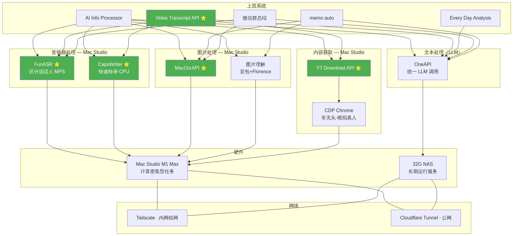 两套本地 ASR 引擎互补,都跑在 Mac Studio 上: